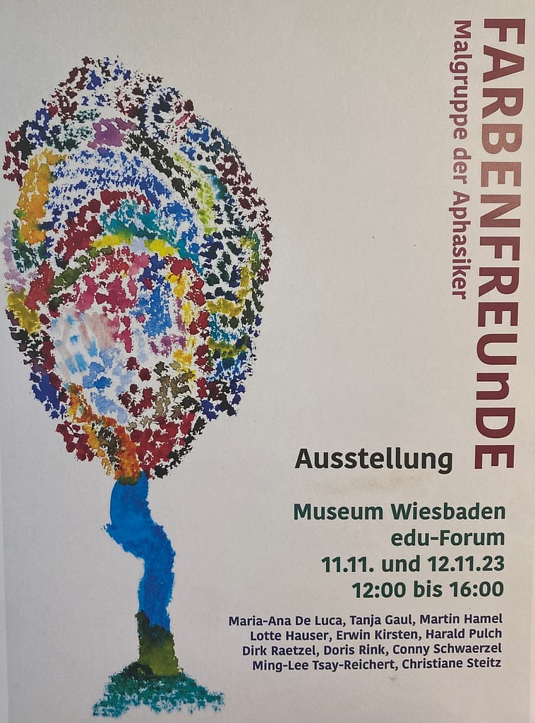 Vorkurzem habe ich eine ganz besondere, kleine Ausstellung im Untergeschoss des Wiesbadner Landesmuseums entdeckt. Zu sehen waren Bilder, die von Menschen gemalt worden waren, die durch einen Schlaganfall ihre Sprache verloren haben – fachsprachlich „Aphasiker“. Die Teilnehmer treffen sich seit Jahren regelmäßig, um gemeinsam ihre motorischen und kreativen Fähigkeiten zu üben. Mit Christiane Steitz, die Organisatorin der Gruppe, habe ich darüber gesprochen, ob man beim Malen unbedingt reden muss.